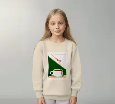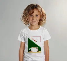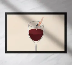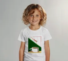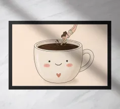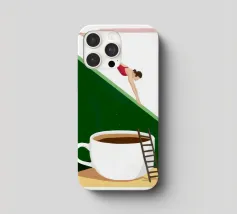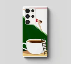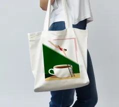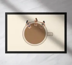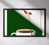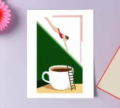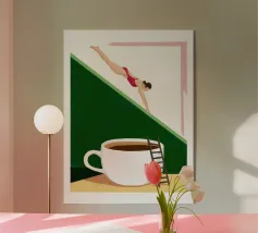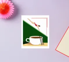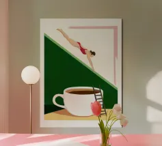 Illustration surréaliste représentant une personne en maillot de bain rouge plongeant d'une petite échelle dans une tasse de café blanche géante. L'arrière-plan est une composition minimaliste de formes géométriques vertes et blanches, créant une scène austère et imaginative.