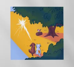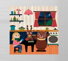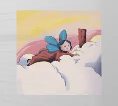 This artwork depicts a grumpy-looking cloud with a thought bubble containing a bird and a bear. The humorous and imaginative scene is set against a soft blue background.