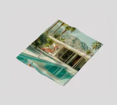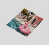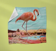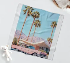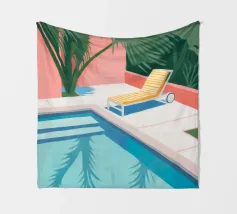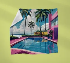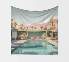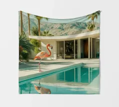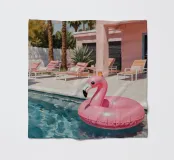 Une scène nostalgique de Palm Springs : un anneau de bain flamant rose dérivant dans une piscine turquoise, encadré par des chaises longues pastel et des palmiers imposants. Cette œuvre d'art apporte un esprit estival rétro, une ambiance de vacances détendue et un charme du milieu du siècle à n'importe quel mur - idéal pour les salons, les chambres à coucher ou une décoration élégante au bord de la piscine.