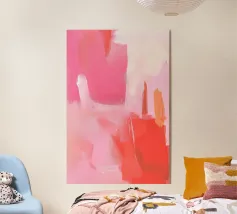 Une exploration audacieuse de la structure par le biais d'une abstraction éclatante. Dominée par des couches de cramoisi, d'orange et de corail, cette composition dynamique associe des formes géométriques à un coup de pinceau expressif, créant une énergie rythmique à la fois architecturale et émotive. Le jeu des angles vifs et des dégradés doux évoque le mouvement, la chaleur et la vitalité - une pièce maîtresse saisissante pour tout espace moderne.