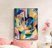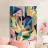 An abstract composition of overlapping, deconstructed shapes in a rhythmic arrangement. The palette of blue, orange, yellow, and nude tones creates a dynamic and harmonious piece with a sense of fluid movement.