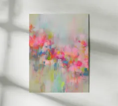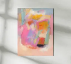 Cette œuvre d'art abstraite représente des aplats de couleurs pastel rose, jaune, bleu, vert et rose qui se fondent les uns dans les autres. Les textures douces du pinceau et la composition harmonieuse des couleurs pop art créent une atmosphère vibrante et vivante. Le motif est moderne, léger et émotionnel, et invite à une libre interprétation.