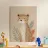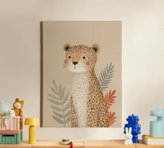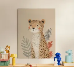 A sweet and softly detailed leopard sits calmly against a warm beige background, surrounded by muted botanical leaves in sage green and soft terracotta tones. With delicate spotted fur, rosy cheeks, and a gentle expression, this charming illustration brings a cozy and comforting feeling to any nursery or child’s room.