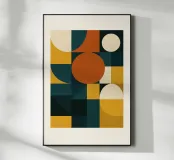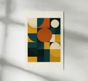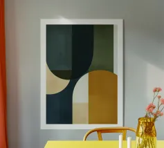 Un design abstrait moderne combinant des formes géométriques audacieuses avec une palette de couleurs chaudes d'inspiration rétro. Parfait pour ajouter une touche d'élégance moderne du milieu du siècle à tout espace de vie ou bureau.