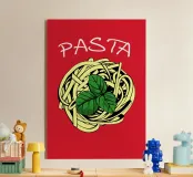 Tagliatelle on a red background with basil leaves and the word 'Pasta'