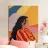 Portrait d'une femme aux longs cheveux noirs, portant un pull à rayures colorées. Son regard direct et l'arrière-plan abstrait aux tons chauds créent une image confiante, moderne et artistique.