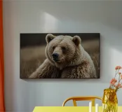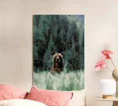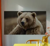 Un ours brun se repose paisiblement parmi les hautes herbes dans un cadre serein, se prélassant dans la douce lumière du matin, entouré par la beauté de la nature.