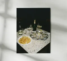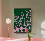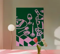 Kontrastreich & Kuratiert: Diese abstrakte Tischszene ist das ultimative Highlight für dein Wohnzimmer. Zwischen Kerzenschein und Champagnerkühler fängt das Design die Magie eines perfekten Dinners ein. Ein Must-have für Design-Liebhaber, die mutige Farbkombinationen und das Unperfekte lieben. Kunst, die Appetit auf Stil macht und deine Interior-Expertise unterstreicht.