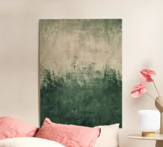 A contemporary abstract composition built around a raw, expressive horizon line. Deep forest green anchors the lower half, while soft beige tones above create lightness and visual breathing space. The textured transition between the two fields introduces subtle movement and painterly depth, giving the piece a refined yet organic character. Minimal in structure, but rich in surface detail, this artwork evokes landscape, stillness, and calm introspection.