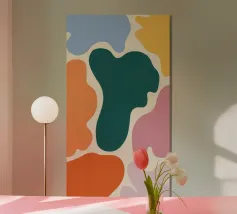 Une composition abstraite moderne et ludique présentant une disposition en grille de formes organiques colorées. L'œuvre ressemble à un puzzle sophistiqué et équilibré de formes et de couleurs.