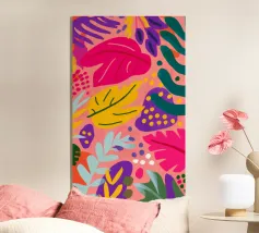 Un motif moderne et graphique de grandes feuilles tropicales rouges et roses sur un fond rose vibrant. Cette composition est une pièce audacieuse, élégante et magnifique de design botanique contemporain.