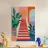 Des escaliers d'un rouge éclatant montent à travers un bâtiment coloré et simplifié vers une entrée luxuriante et voûtée, suggérant un voyage vers une destination belle et exotique.