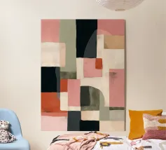 This abstract artwork blends modern clarity with vintage warmth through a composition of rounded geometric forms arranged in a loose grid. Overlapping shapes create gentle intersections, where transparency and color layering generate depth and visual rhythm. A muted palette of ochre, olive, terracotta, blush, and cream evokes mid-century design while remaining distinctly contemporary. Subtle surface texture adds a tactile quality, softening the structure. The piece balances order and fluidity, offering a calm yet engaging visual experience ideal for modern, minimalist interiors.