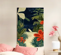 A brightly colored bird perched on a branch next to a large pink flower. The background is filled with abstract foliage and shapes.