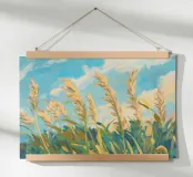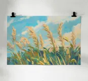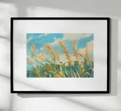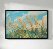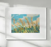 Cette peinture captivante montre un champ de blé serein se balançant doucement sous un ciel bleu clair avec des nuages doux et vaporeux. Les couleurs vives et les coups de pinceau dynamiques donnent vie à la scène, soulignant la beauté et la tranquillité de la nature.
