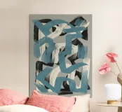 Des traits audacieux de bleu, de blanc et de noir s'entrelacent sur un fond gris neutre, créant une composition abstraite dynamique. Les lignes qui se chevauchent suggèrent le mouvement et le contraste.