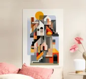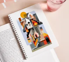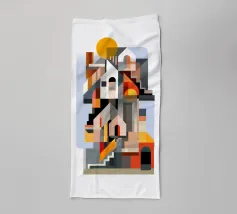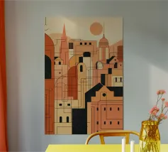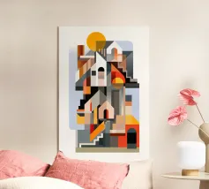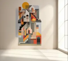 Paysage urbain stylisé dans une représentation plate et abstraite, caractérisée par des formes géométriques et des éléments graphiques puissants. La composition minimaliste utilise des teintes sourdes comme le gris, l'orange, le beige et le bleu et combine des influences cubistes avec des lignes claires et des motifs symétriques sur un fond blanc, créant ainsi un design élégant et moderne. Les éléments ont été réalisés à partir de croquis dans Adobe Illustrator, puis combinés dans Photoshop.
