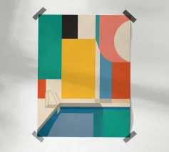 A modern, abstract depiction of a swimming pool with green checkered tiles. A red ball floats on the water, creating a sense of a quiet, sun drenched moment of leisure.