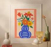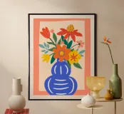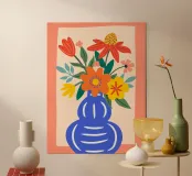 Ce joyeux motif floral représente un vase bleu stylisé rempli de fleurs colorées en orange, rouge, jaune et rose, encadré par un ton corail chaud. Le design respire la joie de vivre et l'harmonie et est parfait pour les tableaux muraux, les coussins, les tasses, les coques de téléphone portable et bien plus encore. Idéal pour tous ceux qui aiment une esthétique fraîche et moderne et qui souhaitent embellir leur intérieur avec des accents colorés et naturels. Cette composition florale intemporelle s'adapte à toutes les pièces et à tous les styles d'intérieur.