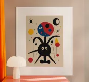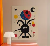 A whimsical and abstract depiction features a cheerful creature with a round body and multiple limbs, surrounded by colorful geometric shapes and playful lines. The vibrant primary colors create a lively and dynamic composition on a neutral background.