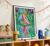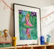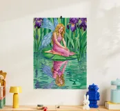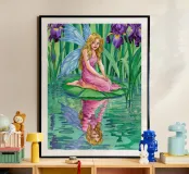 Une peinture fantaisiste représentant une femme blonde assise gracieusement sur un grand nénuphar dans un étang tranquille, entourée d'iris en fleurs, son reflet étant capturé dans l'eau en contrebas.