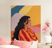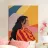 Portrait d'une femme aux longs cheveux noirs, portant un pull à rayures colorées. Son regard direct et l'arrière-plan abstrait aux tons chauds créent une image confiante, moderne et artistique.