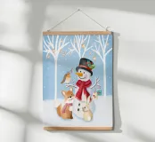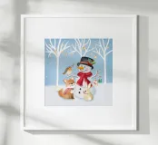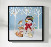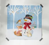 Paysage hivernal de Noël avec bonhomme de neige, renard et lapin poster