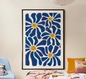 Un motif audacieux et répétitif de marguerites blanches simples et stylisées, avec un centre jaune, se détache sur un fond bleu profond et uni, évoquant une ambiance florale rétro.
