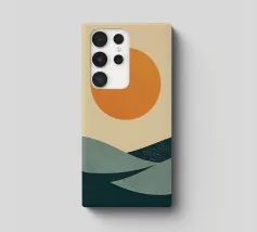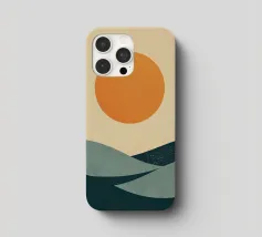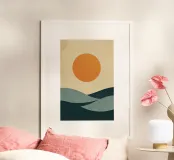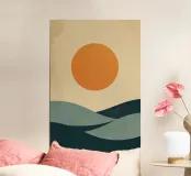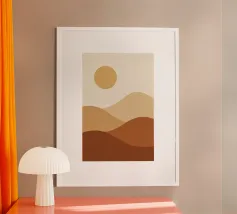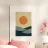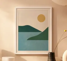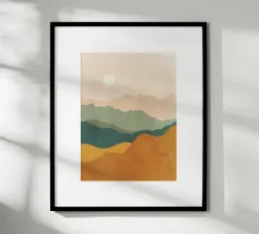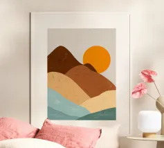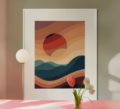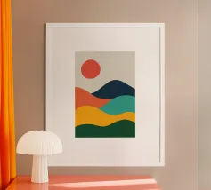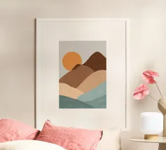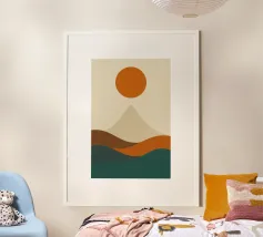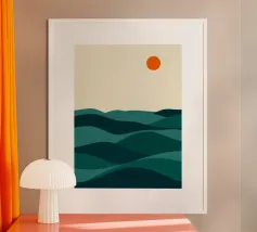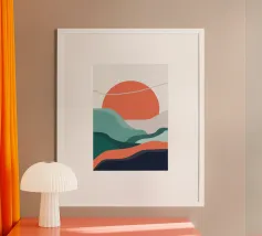 Soleil orange sur les collines sarcelles Digital Art poster avec cadre en bois