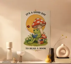 A vivid and whimsical scene featuring a bright pink frog sitting atop a red toadstool with white spots, surrounded by lush foliage and glowing flowers in a misty, enchanted forest. The magical ambiance enhances the surreal beauty.