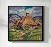 Une scène rurale pittoresque centrée sur une maison rustique ou une grange avec un toit de chaume traditionnel, entourée de champs verdoyants et d'une toile de fond d'arbres lointains sous un ciel clair et lumineux.