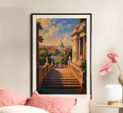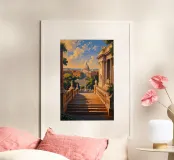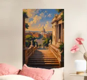 Cette peinture inspirée de la Renaissance dépeint une vue spectaculaire de Rome, où des colonnes monumentales encadrent une scène étonnante d'architecture en dôme au loin. Le jeu d'ombre et de lumière accentue les détails texturés des statues classiques, le feuillage luxuriant et la chaleur de la maçonnerie. Le premier plan invite le spectateur à entrer dans la scène, créant un sentiment de participation à la grandeur intemporelle de la piazza. Les tons vibrants du paysage et les riches éléments culturels se combinent pour célébrer la beauté durable et l'importance historique de la ville.