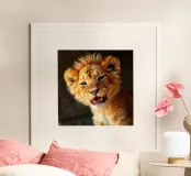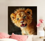 Un mignon lionceau grogne en jouant, mettant en valeur sa fourrure vibrante. poster