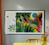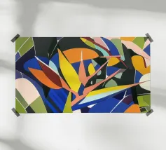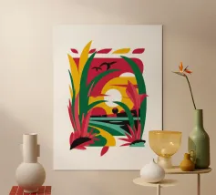 Un paysage abstrait est déconstruit en formes géométriques et en couleurs vives, représentant un soleil, des collines et des feuillages dans une composition fragmentée mais harmonieuse sur un fond sombre.