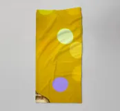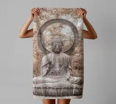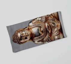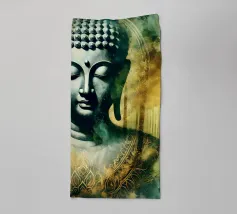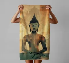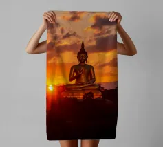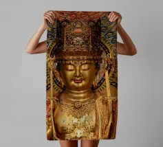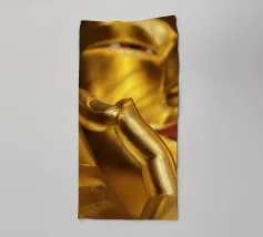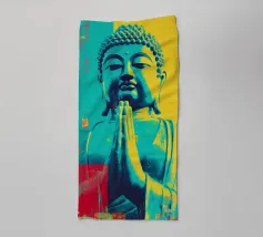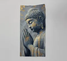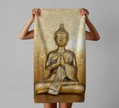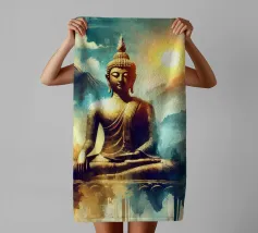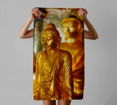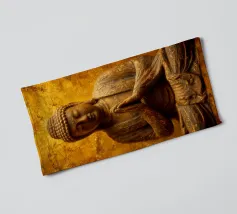 L'image montre une statue de Bouddha dorée sur un fond jaune vif avec plusieurs cercles de lumière. La statue est travaillée en détail et montre Bouddha dans une posture méditative, les mains jointes. La surface de la statue est brillante et structurée, avec des ornements visibles sur la robe. L'arrière-plan est composé d'un jaune intense, complété par des reflets de lumière colorés qui créent une profondeur visuelle et font ressortir la figure.