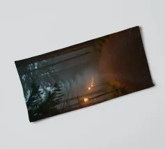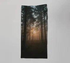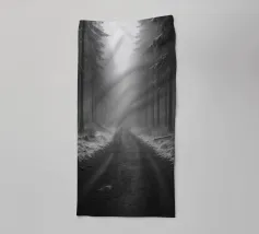 Un sentier forestier serein, enveloppé de brume, est bordé de grands arbres qui se dressent majestueusement. Une lumière douce traverse la canopée, créant une atmosphère tranquille.