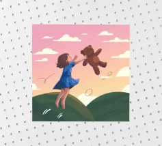 Cette œuvre d'art représente un nuage à l'air grincheux avec une bulle de pensée contenant un oiseau et un ours. La scène humoristique et imaginative se déroule sur un fond bleu doux.