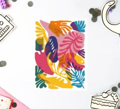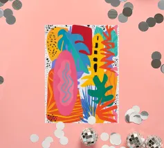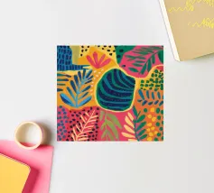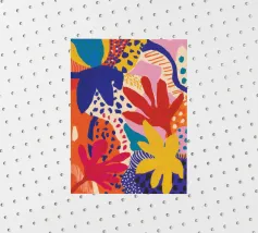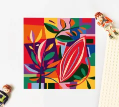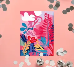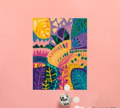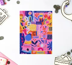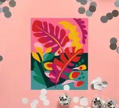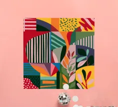 Une grille de différents motifs abstraits et géométriques dans une palette de rose, de rouge et de sarcelle crée un patchwork moderne, artistique et décoratif.