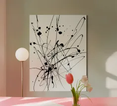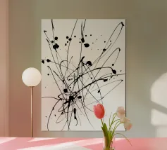 Une œuvre d'art abstrait expressive qui impressionne par ses lignes dynamiques, ses gouttes et ses élans d'un noir profond. Les mouvements apparemment chaotiques créent une composition captivante qui capture l'énergie et la liberté de l'art. Le contraste entre les formes noires et le fond blanc clair fait de cette pièce un accroche-regard parfait pour les habitations ou les bureaux modernes. Cette œuvre dégage une élégance spontanée et offre au spectateur la possibilité de trouver sa propre interprétation.