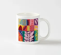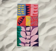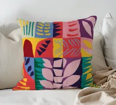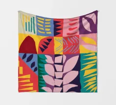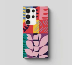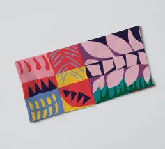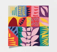 Une grille de différents motifs abstraits et géométriques dans une palette de rose, de rouge et de sarcelle crée un patchwork moderne, artistique et décoratif.