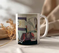 Cette peinture représente deux figures abstraites dans une pose intime. L'utilisation de formes géométriques et de couleurs vives ajoute de la profondeur et de la complexité à la scène.