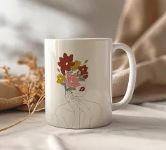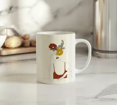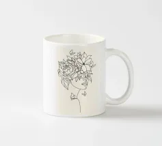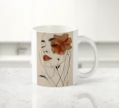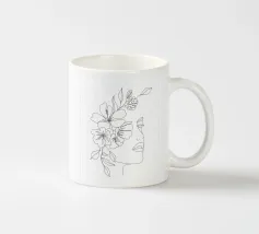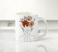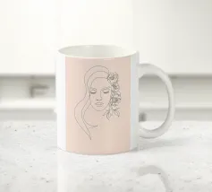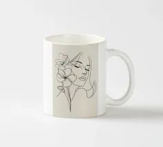 Un dessin au trait minimaliste représente le profil d'une femme à l'expression sereine. Ses cheveux sont ornés de grandes fleurs stylisées orange et jaunes et de feuilles délicates.