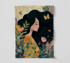 A portrait of a woman with flowing red hair, surrounded by stylized leaves and flowers, looking thoughtfully to the side. The style is modern, bold, and slightly art nouveau.