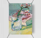 Branche d'amandier en fleur dans un verre avec un livre