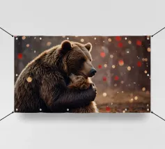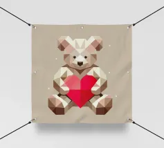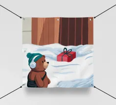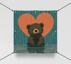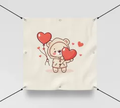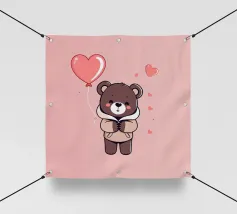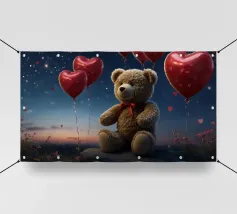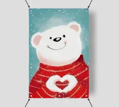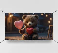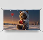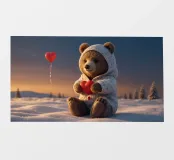 Un adorable ours en peluche vêtu d'un douillet sweat à capuche est assis dans la neige, tenant joyeusement un cœur rouge tandis qu'un ballon dérive dans l'air frais du soir, sous un coucher de soleil coloré.