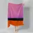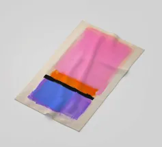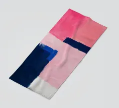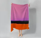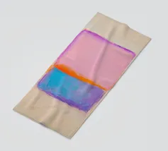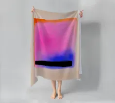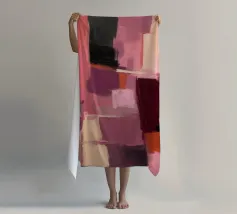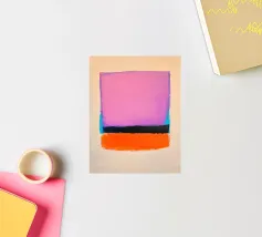 Une peinture minimale et mystérieuse avec des champs de couleurs, une forme abstraite. Le fond est rose clair et le motif principal est dans des tons violets, oranges, noirs et bleus, créant un contraste et un équilibre entre l'espace négatif et la forme positive. Vue aérienne.