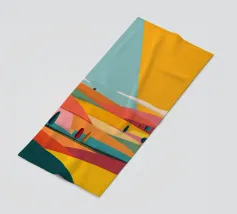 A beautiful landscape of rolling hills and fields, rendered in a colorful patchwork of greens, blues, pinks, and yellows, evoking a sense of idyllic countryside.