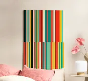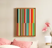Un op-art vibrant en bandes de codes-barres lumineuses : Cette puissante composition abstraite célèbre l'énergie pure des couleurs. Les bandes verticales en rouge, turquoise, jaune, orange et vert foncé rappellent les expérimentations optiques de Bridget Riley. Le décalage rythmique au centre de l'image crée une tension visuelle et un mouvement. L'exécution précise et la palette de couleurs rétro évoquent l'esthétique du design des années 1960. Un jeu hypnotique de perception et de rythme - une abstraction contemporaine à l'impact visuel maximal. Parfait pour les amateurs d'art géométrique et de compositions de couleurs puissantes.