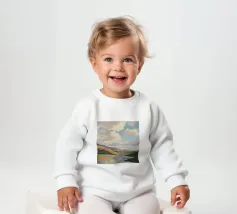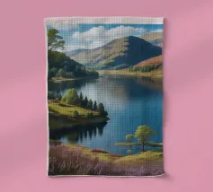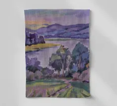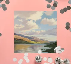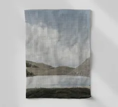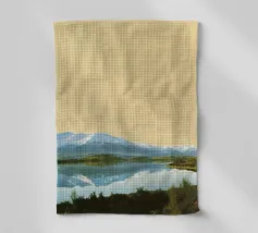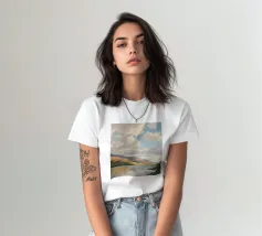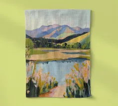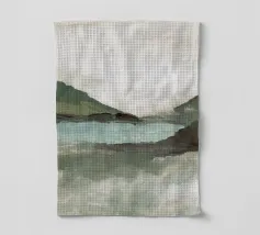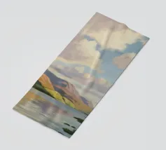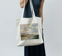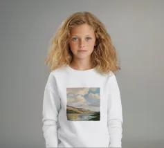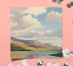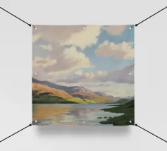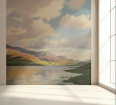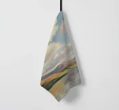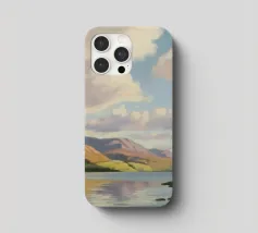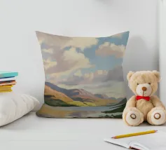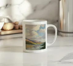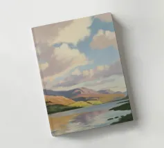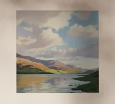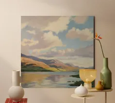 Peinture de paysage représentant des collines vertes et brunes sous un ciel doux et nuageux, avec une étendue d'eau au premier plan.