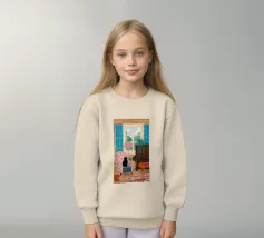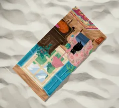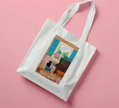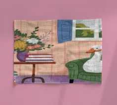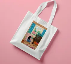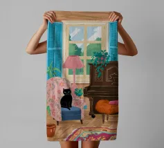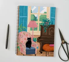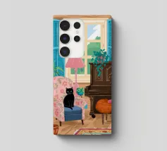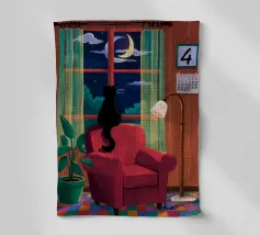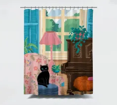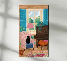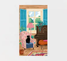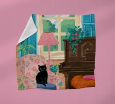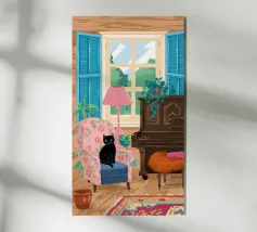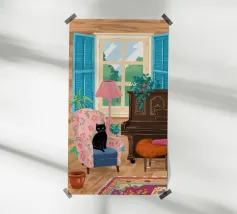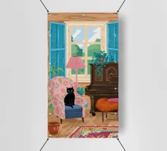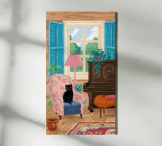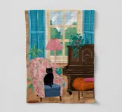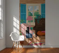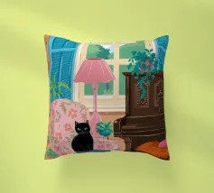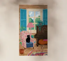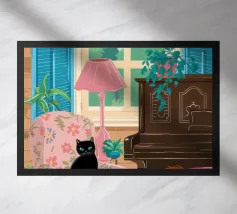 Scène d'intérieur mettant en scène un chat noir assis dans une pièce confortable avec une statue de flamant rose et une femme lisant dans un fauteuil. La composition est éclectique, élégante et constitue un instantané charmant d'une maison pleine de personnalité.